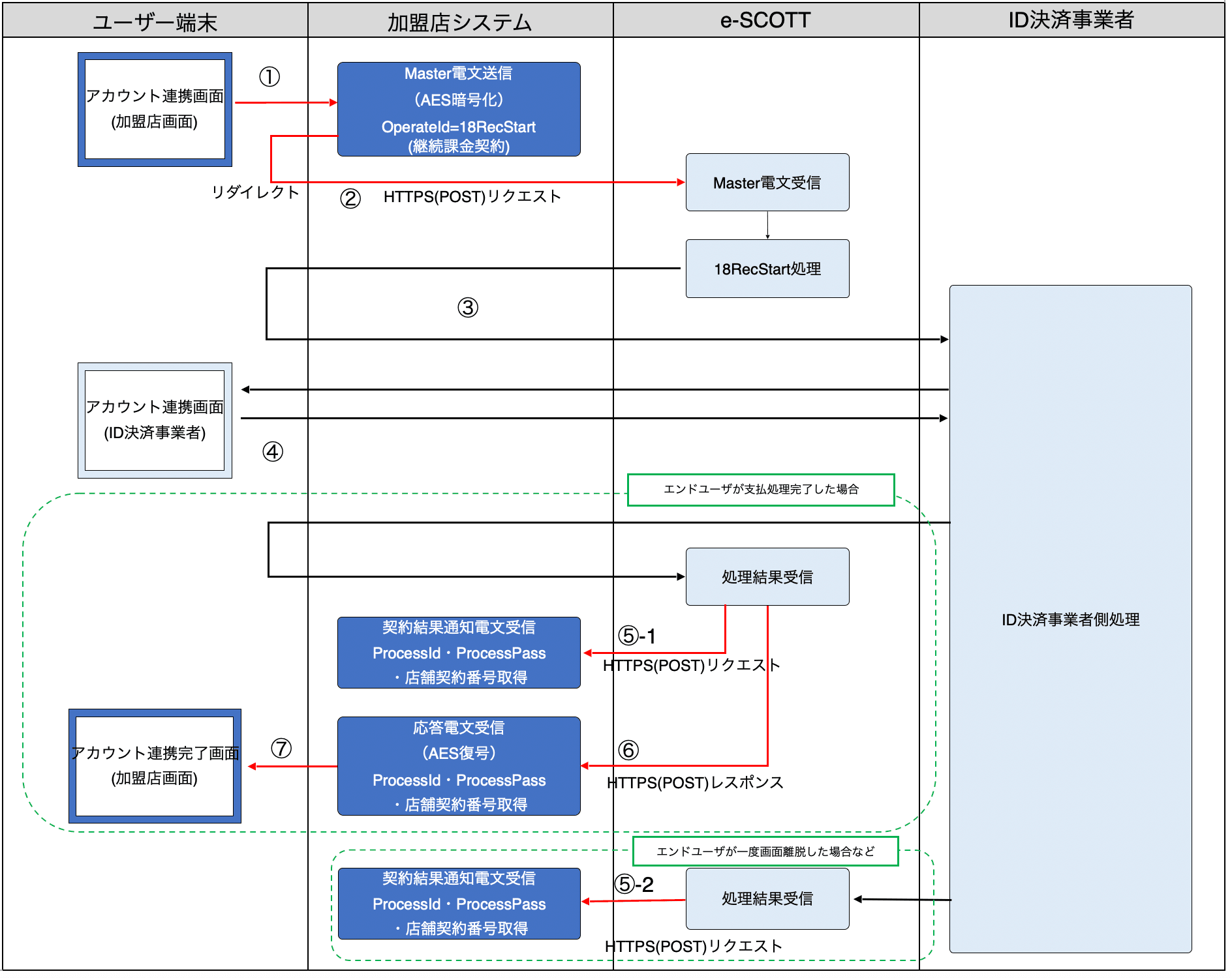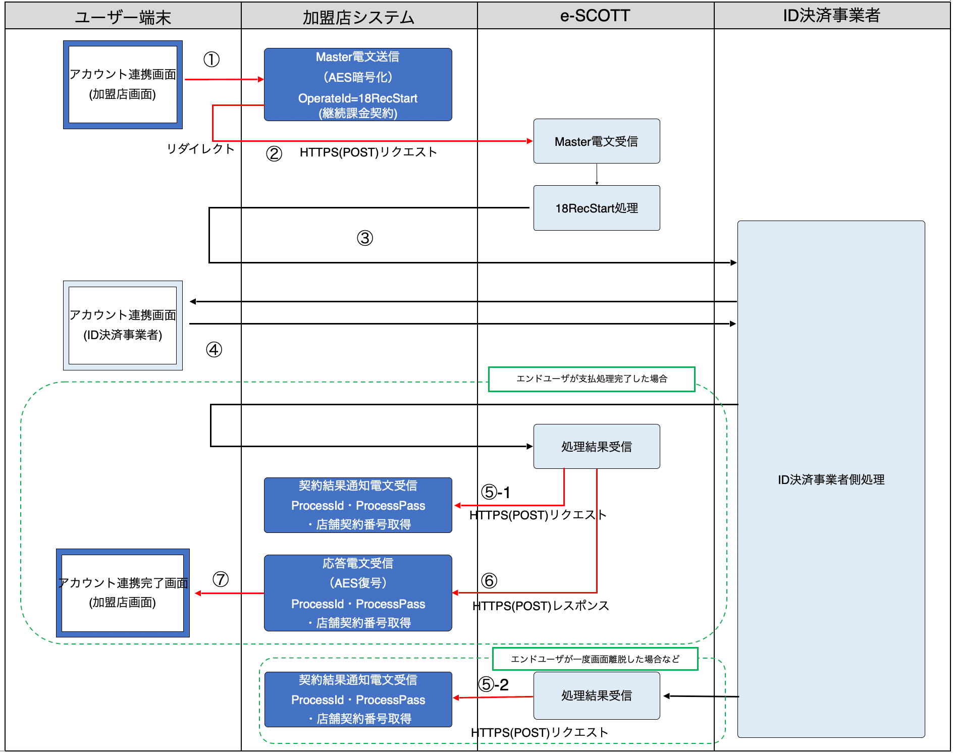 エンドユーザが一度画面離脱した場合などに、処理結果およびプロセスID・プロセスパスワード・店舗契約番号を、e-SCOTTから加盟店へPOST電文で通知します。 ・ 店舗契約番号とは、継続課金契約時に本システムで採番する番号です。 店舗契約番号に紐づくユーザーに対しID決済事業者への支払要求を行います。 |