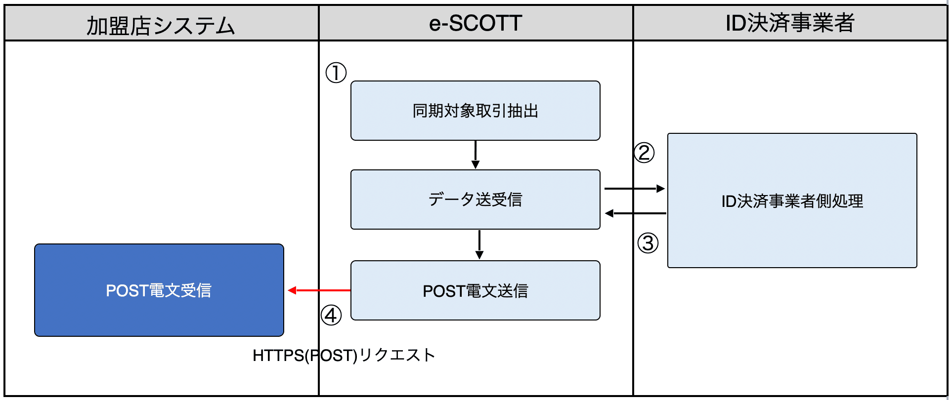 | ② | 抽出した取引に対し、同期要求電文を e-SCOTT から ID 決済事業者に送信します。 | |