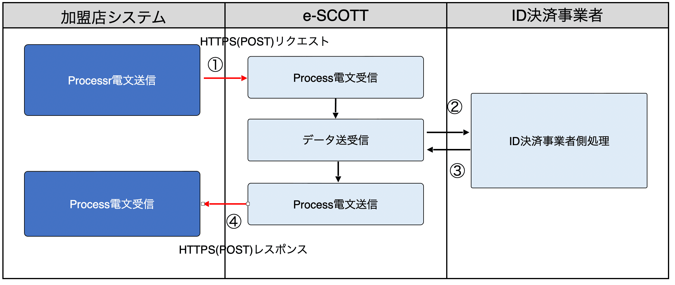 | ② | 加盟店から送信された Process 電文をもとに、対象処理区分の要求電文を e-SCOTT から ID 決済事業者に送信します。 | |