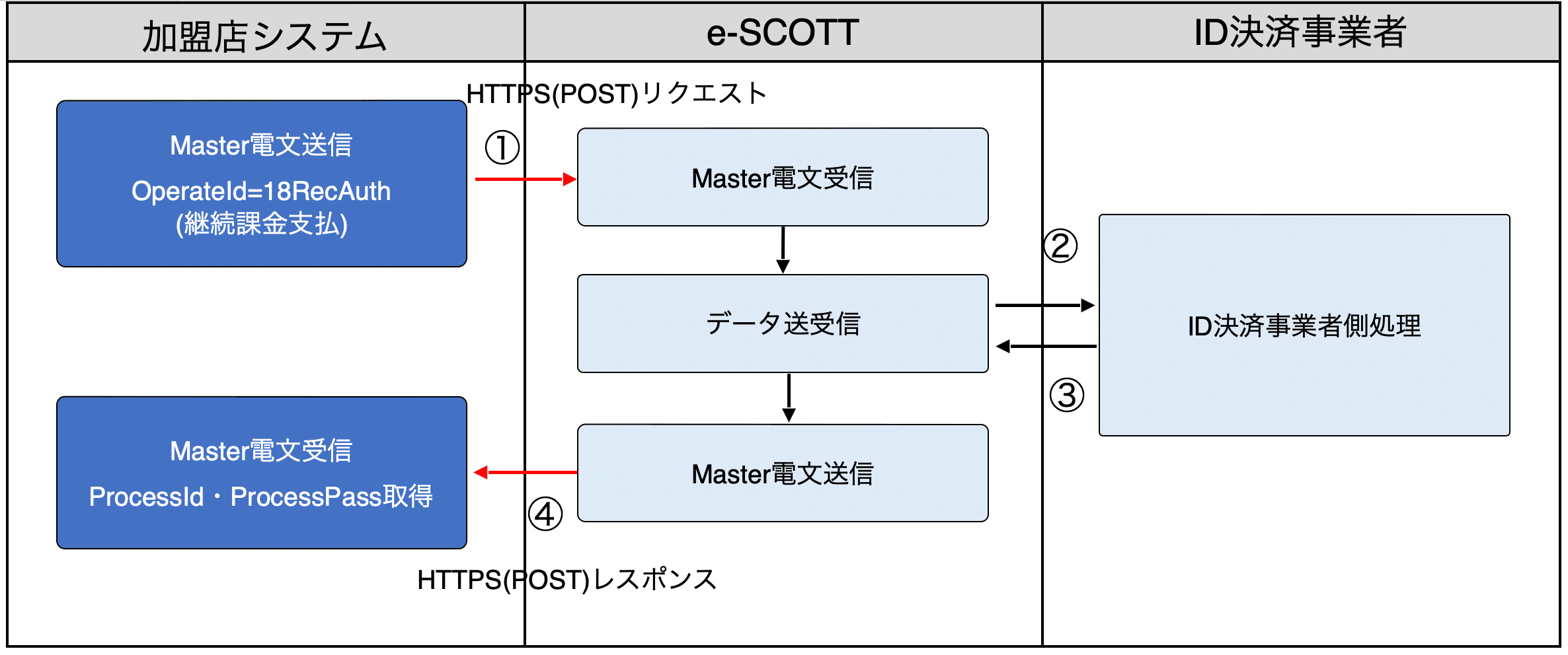加盟店から送信されたMaster電文(店舗契約番号に該当する取引)をもとに、継続課金支払要求電文をe-SCOTTからID決済事業者に送信します。 | |
